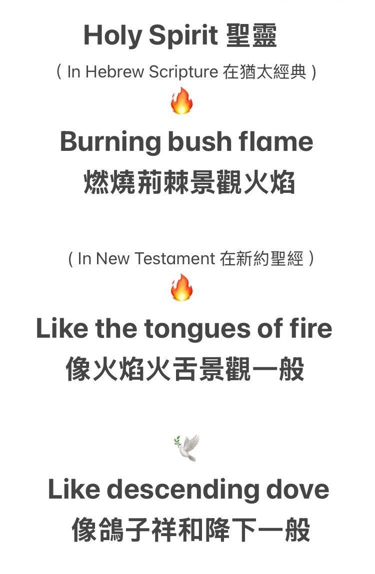 ( 圖顯示:在舊約聖經中,神的靈 (神的使者) 以燃燒荊棘火焰的方式出現 (出埃及記 3:2)。在新約聖經中,聖靈以火焰火舌的方式,出現在五旬節聚會。當耶穌受洗時,聖靈像鴿子降下一般的祥和的方式降臨。)